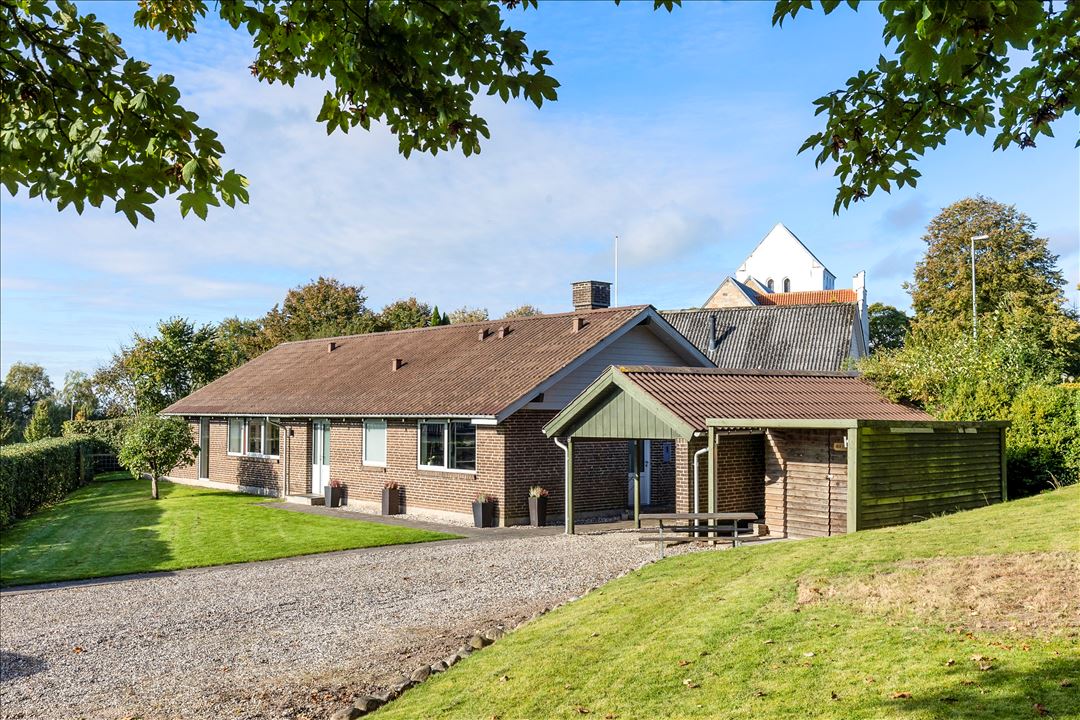 Udenfor har du fornøjelsen af hele 1.280 kvm grund med hyggelige træer, der giver rig mulighed for børnene at boltre sig i som­mer­må­ne­der­ne. Til dig der ønsker privatliv og god afstand til naboerne, er grundens kvm fordelt helt ideelt uden at bringe for meget vedligehold ind i hverdagen. Af hverdagens prak­ti­ka­li­te­ter vil du nyde godt af en carport med tilhørende 2 skure af en god størrelse.
