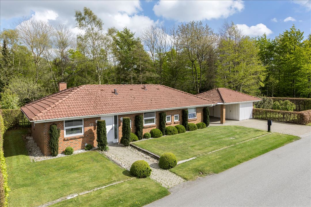 Til boligen hører en stor carport, der er integreret med huset, så du kan gå tørskoet ind. Derudover er der to store redskabsrum, der giver rigelig opbevaringsplads til haveredskaber, cykler og opbevaring.