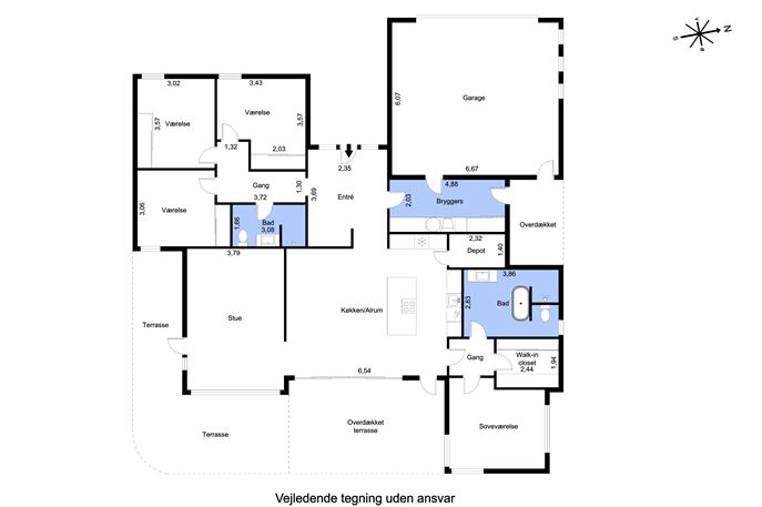 I boligens anden ende finder I en børneafdeling med tre store værelser og eget badeværelse. Her er også et praktisk bryggers med direkte adgang til den store dobbelte garage på 50 m² – naturligvis med gulvvarme.