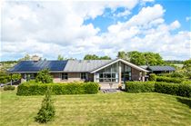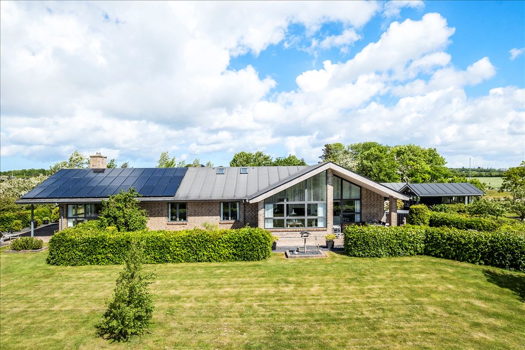 Udenfor kan man nyde den smukt anlagte have med terrasser og fliser hele vejen rundt om huset. Der er også et charmerende havehus og et velindrettet redskabsrum, begge på 22 kvadratmeter, som kan bruges til både opbevaring og hyggelige stunder. Ejendommens solcelleanlæg bidrager til en energibesparende hverdag, og den rummelige indkørsel med parkeringsareal giver god plads til både gæster og egne køretøjer.