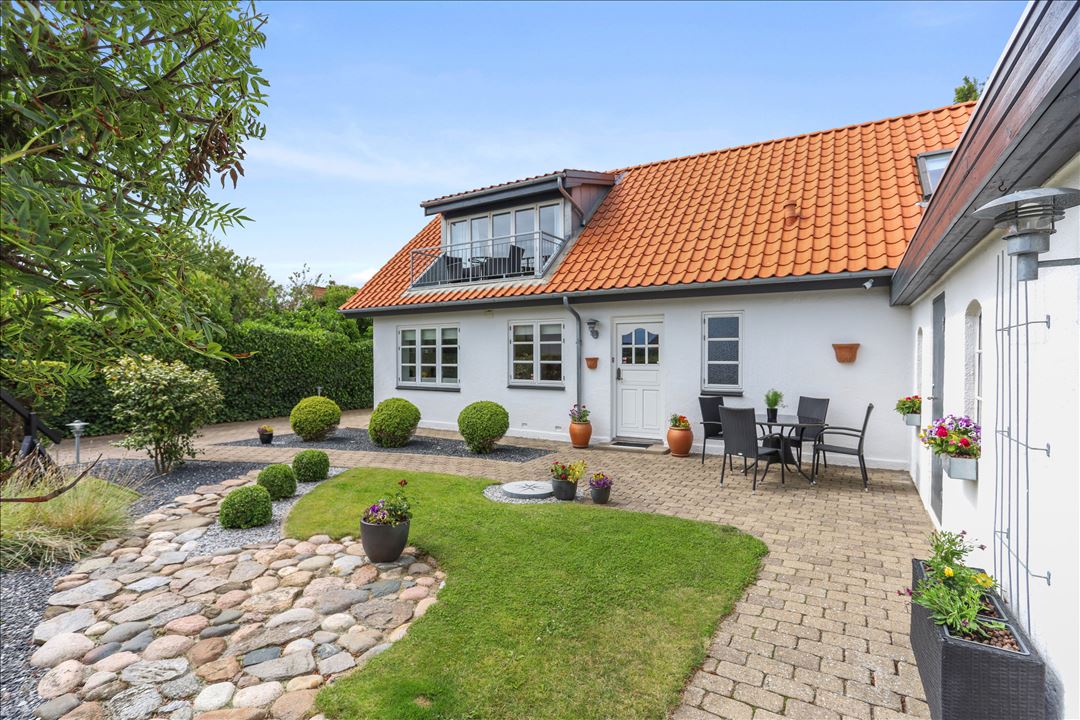 Det skønne haveområde er anlagt smukt og med et minimum af krav til pasning. Husets forhave er en form for gårdhavemiljø med en morgenterrasse, stensætninger og fliseareal. Husets have mod syd og vest fremstår enkel og smuk med plæne, forskellige frugttræer og en skøn terrasse.