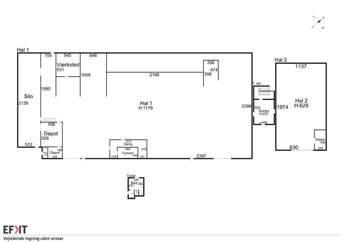 Hallen er ca. 45 meter lang, 24 meter bred og max. loftshøjde på hele 12 meter. For enden af hallen er der et tillige et siloområde, der har været anvendt til betonproduktionen. Der er 2 porte i bygningen.
