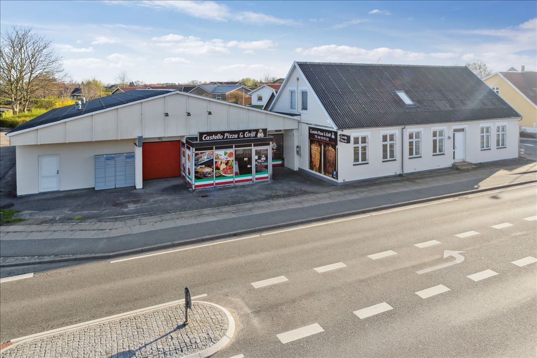 Ejendommen fremstår i pæn og velholdt stand og er opført i år 1906.Taget er med eternittag plader, og facaden fremstår vandskuret og malet. De to erhvervslejemål udgør tilsammen 364 m² og er i dag udlejet til henholdsvis et pizzeria og en lokal forening. Lejemålene indeholder butikslokaler, lager samt mindre kontor- og personalefaciliteter.