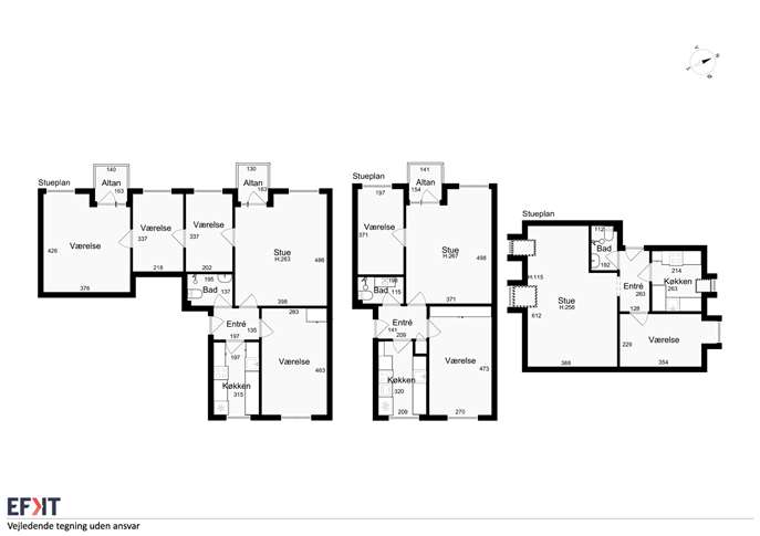 Lejlighederne på 3. sal er en smule mindre grundet de skrå vægge, her på hhv. 55 -57 m² og består af stor stue, soveværelse, køkken og toilet, alt sammen placeret ud til fælles fordeler gang og således delevenlige. Trods de skrå vægge er lejlighederne lyse og yderst præsentable, hvorfra er et godt vue over hele området. I stueplan findes ligeledes 2 lejligheder – dog er her st. tv. registeret som en ét-værelses lejlighed med eget køkken og toilet og på 35 m². Stuen. th., hvortil er tillagt de resterende beboelsesrum fra nabolejemålet, består således af 5 rum på i alt 98 m² - her med adgang til hele 2 altaner, hvilket inkluderer 3 meget store beboelsesrum/stuer og 2 kamre. Og, naturligvis med bad og køkken.