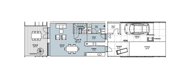 Der er carport samt skur og terrasse til alle boliger.