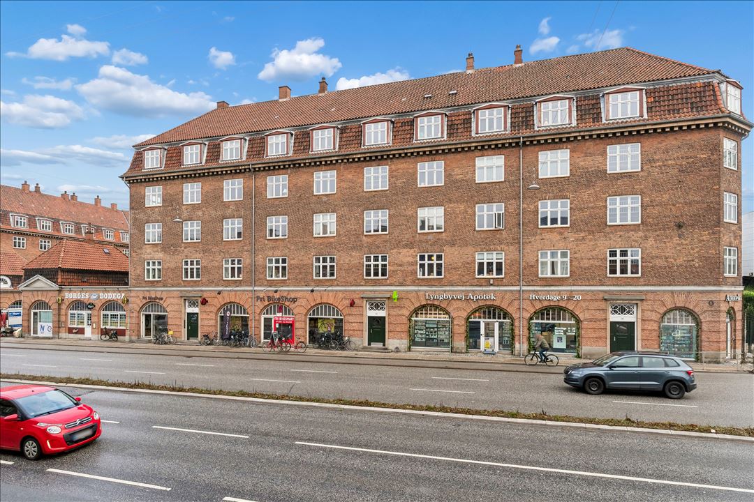 Er­hvervsan­de­len er beliggende i en markant ejendom fra 1924 med flot facade mod Lyngbyvej, en af Københavns mest trafikerede indfaldsveje, hvilket giver høj eksponering og god synlighed.