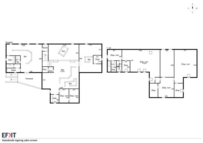 Enhed 1 består af 542 m² anvendt til diskotek Klods Hans. Her med 150 m² registeret i den høje kælder, der består af indgangsparti med garderobe, toiletfaciliteter osv. samt adgang til selve diskoteket i stueetagen via intern trappe. Her er 392 m² bestående af bar-, sidde- og danseområde, dj-bur, køkken og baglokale herunder med lagerfaciliteter osv. Diskoteket er fortsat i (minimal) drift og vil kunne fortsætte hermed med eller uden større renovering.