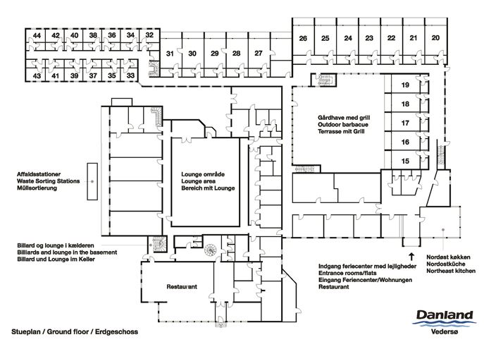 Mange af ferielejlighederne i Vedersø har køkken. I de ferieboliger, hvor der ikke er det, har centret installeret flere fælleskøkkener rundt om på etagerne, hvor man kan tilberede og spise sin mad. På Vedersø Feriecenter finder du også restauranten Vedersø Diner, hvor du kan nyde et lækkert måltid. Lejlighederne fordeler sig med 7 store enheder til 8 personer, 7 stk. 2 værelses lejeliger med dobbeltseng og sovesofa. Disse lejligheder har 2 badeværelser. Der er 23 værelser på ca. 25 kvm. Alle med dobbelt seng + sovesofa. Der er 13 vestvendte værelser til 2 personer i stueplan samt 7 vestvendte lejligheder på 1 sal. Derudover 10 værelser til 2 personer. Der er i dag 67 værelser i drift til udlejning, med mulighed for at etablere flere værelser på sigt. Udover værelser/lejligheder er der ligeledes et tilhørende sommerhus til ejendommen.