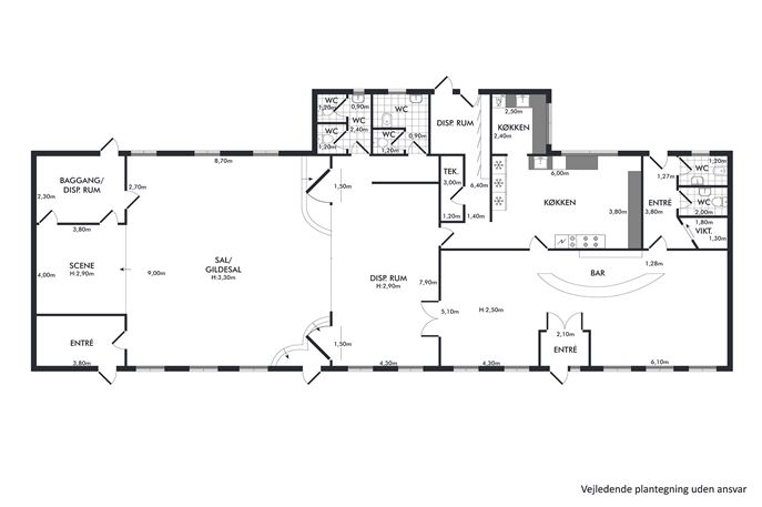 Ejendommen rummer også en smuk og rummelig gildesal, som udgør et naturligt centrum for større arrangementer. Her er der god plads til mange mennesker, og salen egner sig perfekt til bryllupper, konfirmationer, fester, møder, kurser og andre typer events. Til ejendommen medfølger desuden service til ca. 200 personer, hvilket gør det nemt hurtigt at etablere selskabsdrift eller udlejning.