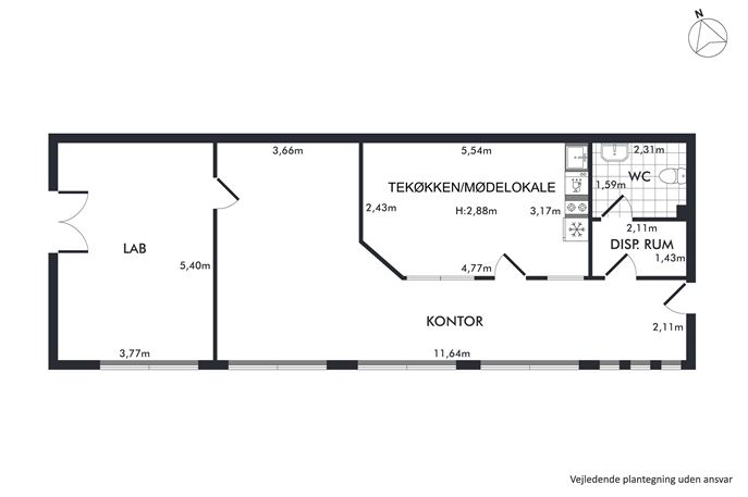 Lejligheden har tidligere været indrettet med kontor og eget laboratorie, hvilket gør den særligt anvendelig for virksomheder med behov for både administrative arbejdspladser og mere specialiserede funktioner. Indretningen giver fleksible muligheder og kan tilpasses en bred vifte af erhverv – herunder rådgivning, klinik, tekniske funktioner eller lettere produktion.
