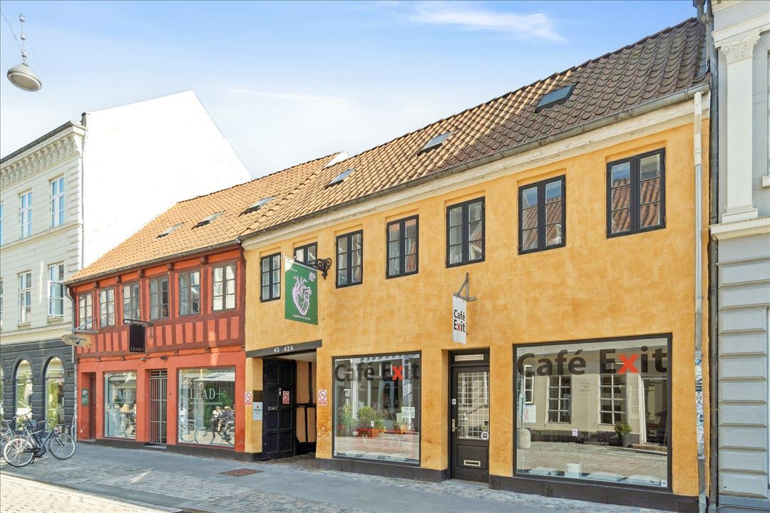 Som købstad har Aarhus for længst rundet 1.000 år – Byens gamle navn (Aros) betyder ”ved åens munding” og det var netop ved udmundingen af Aarhus Å, at byen blev lagt – her valgte man sidenhen at opføre den ikoniske Domkirke, hvorfra de gamle udfaldsveje gik – inkl. Vestergade, hvis historie således næsten er lige så gammel og spraglet som byens historie. Dette gælder ligeledes ejendommen her, der har en mindst lige så spændende historie: Her har fra opførelsen været både traditionel handel, siden hen gæstgiveri og hotel, dansesal og restaurant, møbelhandel og senest mere traditionelt kontor og detail samt beboelse.Den oprindelige del af ejendommen, hvilket kan dateres til ca. år 1750, med de karakteristiske bindingsværksmure, har facade midt på Vestergade, med adgang via egen træport til aflukket og hyggelig baggård, hvor der er mulighed for parkering af 3-4 biler. Bygningen er i stil med de fleste af gadens ejendomme opført til handel og rummer i dag mindre detaillejemål i stueplan, samt kontor på de 2 øvrige etager. Alt sammen moderne renoveret, med spændende detaljer, synlige træspær mv. og med respekt af ejendommens oprindelige udtryk.