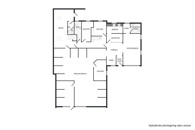 Indvendigt byder klinikken på en indbydende reception med stort venterum og opholdsområde, der tilsammen skaber en rolig og professionel atmosfære. Herudover rummer ejendommen et kontor, personalerum, handicapvenligt toilet samt et stort behandlingsafsnit indrettet med flere kabiner og et separat behandlingsrum – ideelt til en bred vifte af behandlingsformer.