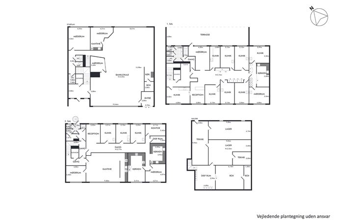 Førstesalen udgør 221 m² og blev for få år siden totalindrettet som moderne lægeklinik. Arealet fremtræder lyst, funktionelt og tidssvarende. På 2. sal forefindes ca. 75 m², som fortsat benyttes af Jyske Bank, mens de resterende 201 m² står ledige. Etagen har tidligere været anvendt til klinik og fremstår pæn, men der må påregnes en større istandsættelse ved ny udlejning eller eventuel konvertering til boligformål. Begge etager afleveres ledige og giver køber gode muligheder for videreudvikling – enten til klinik, erhverv eller potentielt bolig, afhængigt af behov og visioner.