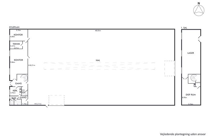 Den største del af ejendommen udgøres af en opvarmet lagerhal med høj loftshøjde, som giver optimale betingelser for opbevaring, produktion eller tung håndtering. Hallen er udstyret med kranmuligheder og har gode adgangsforhold, der gør den oplagt til logistik, produktion eller håndværksrelaterede aktiviteter.