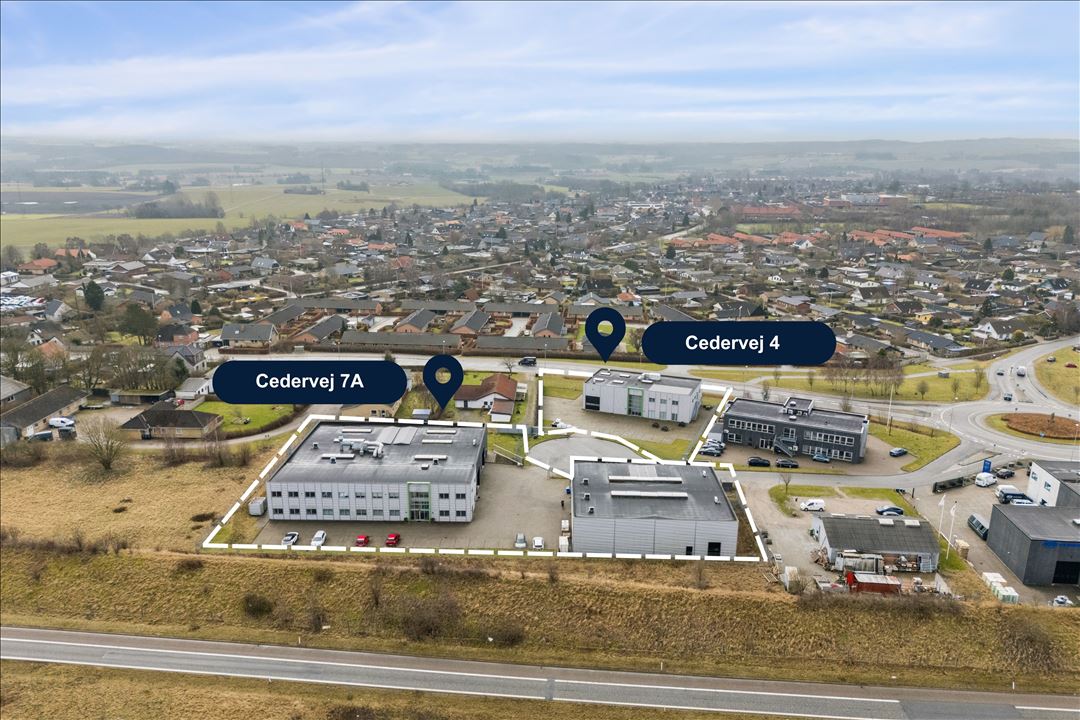 Ejendommen på Cedervej 7A består af to bygninger på henholdsvis 1.548 m² og 702 m², opført i 2018 og 2020. Den største bygning indeholder moderne kontorfaciliteter i to etager på ca. 614 m², mens den resterende del er indrettet som højloftet, isoleret og opvarmet lager med stor portadgang. Den anden bygning består primært af lagerfaciliteter med ca. 85 m² kontor- og personalefaciliteter.