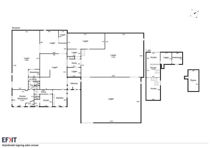 Derudover findes et lyst og anvendeligt kontor på ca. 50 m² på 1. sal, som kan benyttes til administration eller mødefaciliteter. Arealet er ikke registreret i BBR og indgår derfor ikke i det officielle etageareal.