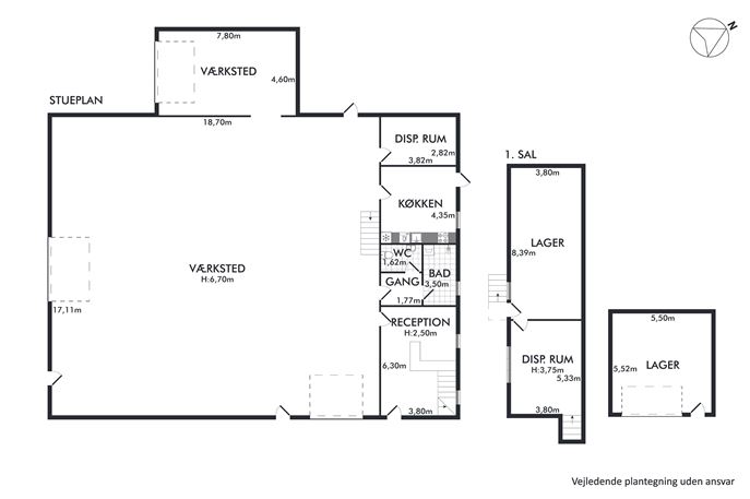 Hovedbygningen udgør i alt 487 m², indrettet med værkstedsfaciliteter, kontor samt lager. Hertil kommer 31 m² koldlager/miljørum, samt 3 containere, anvendt til lager og dækdepot, med samlet areal på 66 m².