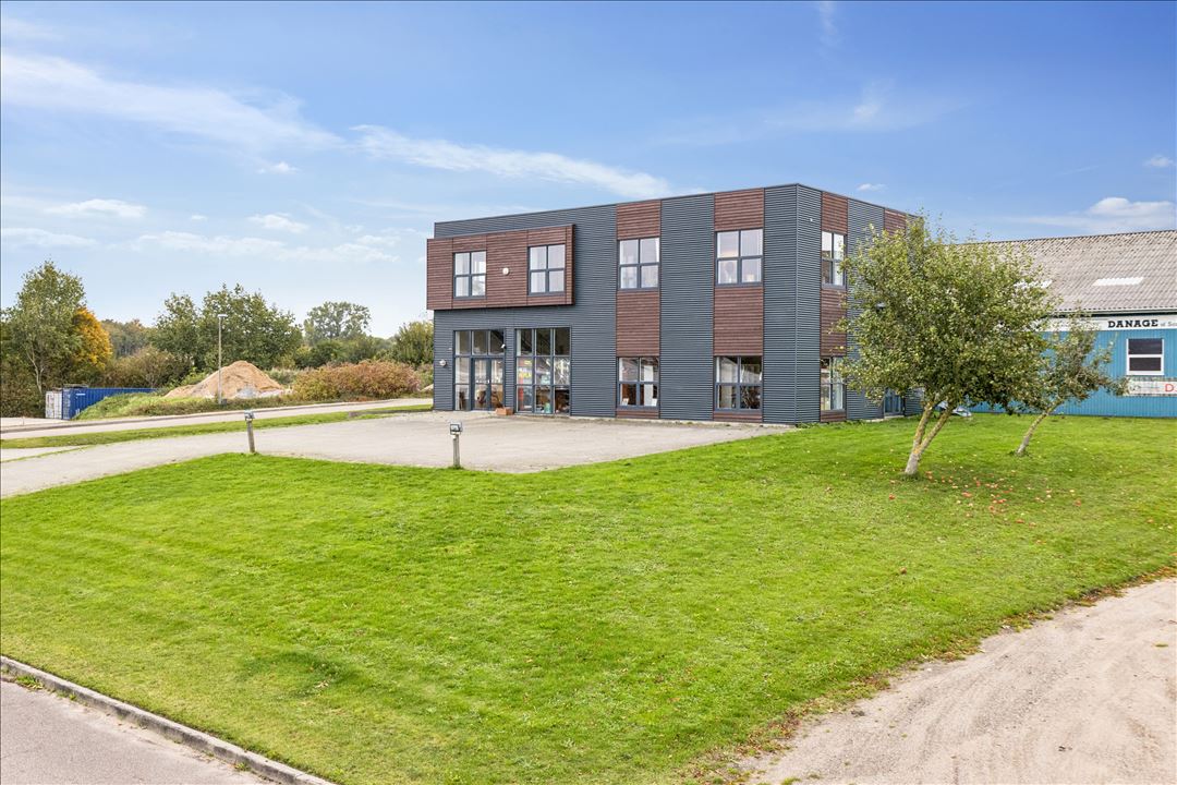 Ejendommen er opført i et stilrent design med kombination af træ- og stålbeklædning, store vinduespartier og et lyst, imødekommende udtryk. Her får din virksomhed både professionel profil og synlig beliggenhed med god tilkørsel og par­ke­rings­for­hold lige foran døren.