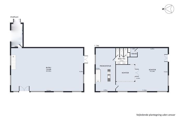 Lokalerne udgør i alt 338 m² fordelt på to plan – hver etage på ca. 168 m². Stueplan fremstår åbent og indbydende med højt til loftet, store facadevinduer og masser af naturligt lys. Her er plads til både butik, showroom eller lager/udstilling. Der er direkte adgang via dobbeltdør i glas samt port, hvilket giver fleksibilitet til både va­re­ind­le­ve­ring og kundeindgang.