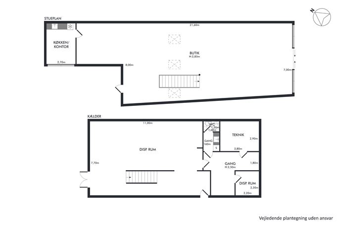 Fra salgsarealet er der trappeforbindelse til kælderplan, som kan anvendes til yderligere salgsareal, lager eller anden opbevaring. Kælderen rummer desuden toilet samt flere mindre disponible rum. Fra begge etager er der adgang til baggård med renovationsforhold og vareindleveringsmulighed, hvilket sikrer praktisk varehåndtering.