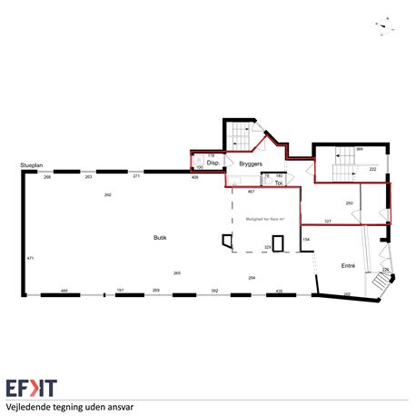 • 227 m² (Lejemål uden det forreste lokale og eksisterende køkken –består af ca. 141 m² i stueplan og 50 m² kælder)