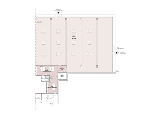 Showroomet er flisebelagt og giver et rustikt look samtidigt med et godt lysindfald fra de store vinduespartier og ovenlysvinduer godt fordelt over hele lejemålet.