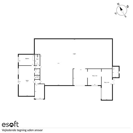Via hovedindgangen træder man ind i et stort kontorlokale/reception på ca. 63 m². Herfra er der direkte adgang til stort køkken/fællesrum, samt lille opbevaringsrum, toilet og badeværelse. Fra kontorlokalet/receptionen er to mellemgange ind til det store lagerlokale. Fra den ene mellemgang er der endvidere tilgang til yderligere et kontor på ca. 17 m².