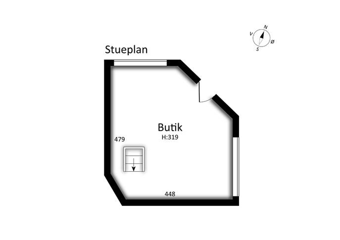 Butikslokalet er i alt 68 m² fordelt på 24 m² lyst salgslokale i stueplan med store facadevinduer og glasindgang fra hjørnet samt 44 m² kælder med lagerplads, tilstødende lokale med dagslys og toiletfaciliteter. Der er adgang til kælderen både indefra butikken og via baggården.
