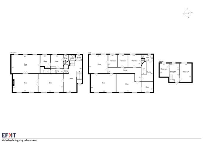 • Stueplan: 124 m² med receptionsområde, 3 store kontorlokaler, mindre kontor, mødelokale og toilet