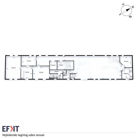 Nuværende indretning indeholder 7-8 kontorer i forskellige størrelser, te-køkken, samt tre toiletter, hvoraf det ene inkluderer et bad. Generelt er lejemålet lyst og rummelig - et ideelt lejemål der kan danne rammerne for virksomheden, der ønsker en central beliggenhed i Aarhus.