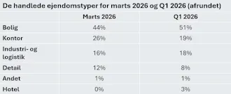 Transaktionsvolumen for marts lander på 3,1 mia. kr., hvilket er en lille fremgang i forhold til tidligere på året, hvor transaktionsvolumen endte på 2,7 mia. kr. i januar og 2,5 mia. kr. i februar. I forhold til marts 2025 er der fremgang at spore inden for detail og kontor. I alt lander transaktionsvolumen for marts 2026 på 81% af transaktionsvolumen i marts 2026.