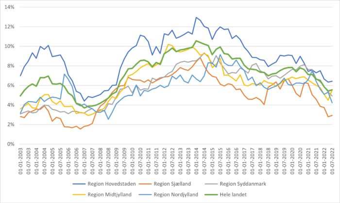 Ser vi på andelen af ledige kontorlokaler på landsplan, udgør tomgangen 5,5% i 3. kvartal 2022, hvilket er en lille stigning på 0,1 procentpoint siden sidste kvartal. Bortset fra sidste kvartal er der dog tale om det laveste niveau siden 2009.