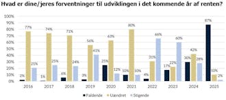 "En af de helt store forskelle fra sidste år er renten. I år forventer hele 87% faldende renter i 2025, mens 10% forventer et uændret renteniveau. På trods af at størstedelen forventer faldende renter, peger 68% stadig på, at renten bliver den væsentligste udfordring for erhvervsejendomsmarkedet i det kommende år, hvilket bekræfter, at renten er det helt store emne i branchen."