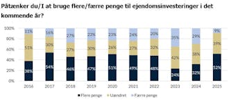 "Der er en klar optimisme at spore ud fra svarene sammenlignet med de sidste par år. Bl.a. forventer 52%, at de vil bruge flere penge på ejendomsinvesteringer i 2025, hvilket er en stigning på hele 20%-point fra sidste år og faktisk det højeste niveau siden forventningerne til 2017, hvor 54% forventede at bruge flere penge. Samtidig er der blot 9%, der forventer at bruge færre penge, hvilket er det laveste niveau i de 10 år, vi har gennemført vores forventningsundersøgelse. Det er en god indikation på, at det går den rigtige vej."