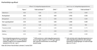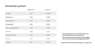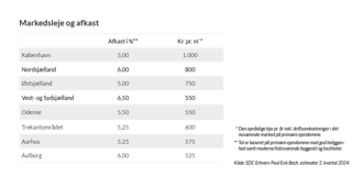 Kombinationen af høje renter og stigende skatter øger incitamentet til at leje frem for at eje, særligt i de største byer. Sammen med faldende byggeaktivitet lægger det pres på lejemarkedet, hvor lejeniveauer flere steder ventes at stige. Tomgangen er faldet 0,8 procentpoint på et år til 3,4% og er lavest i København, Københavns omegn og Nordsjælland, og højest i Midtjylland og Aalborg. Markedslejen forventes stabil til let stigende i 2025, mens afkastkravene forventes at forblive stabile.