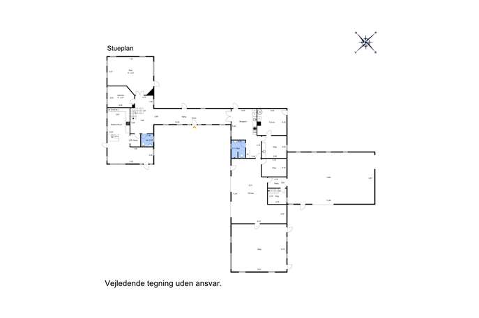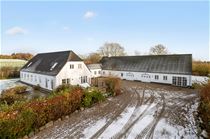 På modsatte side af entréen ligger en selvstændig afdeling med eget badeværelse, oplagt til gæster, teenagerafdeling eller en mindre separat lejlighed. Herfra er der direkte adgang til garagen og driftsbygningerne, som rummer maskinhal samt et stort uudnyttet rum med gode muligheder for f.eks. hestehold eller ekstra opbevaring. Over bygningerne er der yderligere uudnyttede loftrum.
