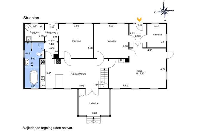 • Grundplan (144 Kvm): Indeholder 3 værelser, et lyst køkken og badeværelse fra 2006 samt 2 stuer.