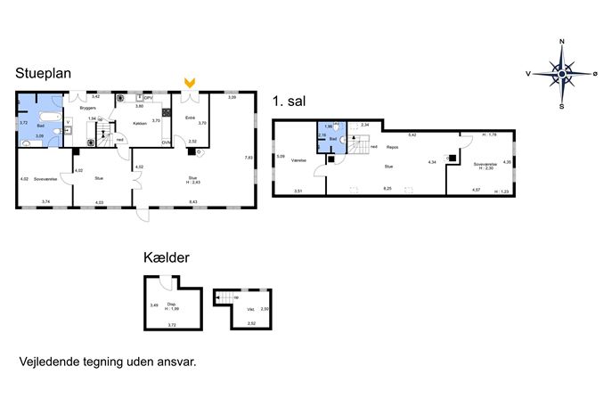 Stuehuset byder velkommen via praktisk bryggers. Bryggerset ligger i direkte forbindelse med køkkenet. Den store og rummelige vinkelstue med plankegulve ligger i forbindelse med køkkenet. Her er også entréen. Endeligt findes i stueplan også både soveværelse og badeværelse med gulvvarme. Første sal er indrettet med to store værelser, fællesområde/aktivitetsrum/kontor samt badeværelse. Aktivitetsrummet kan med fordel opdeles i yderligere værelser, såfremt den store familie flytter ind
