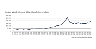 Der har været forholdsvise kraftige stigninger i jordpriserne fra starten af 2022 til 2. kvartal 2023. I 1. kvartal 2022 var jordpriserne på 153.500 kr. pr. ha, hvilket i 2. kvartal 2023 er steget til 192.000 kr. pr. ha, svarerende til en stigning på godt 25%. Siden 1. kvartal 2023 er prisen steget med 10.500 kr. pr. ha, svarende til knap 6%.