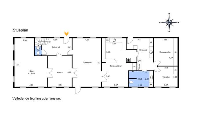 · Indrettet med hyggeligt spisekøkken hvorfra der er udsigt til både gårdspladsen og haven. 3 stuer/kontor, 3 soverum, badeværelse, 2 toiletter, for og baggang.