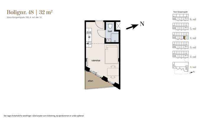 LEJEBOLIGERNE i huset på Store Kongensgade består primært af 1-værelses studiolejligheder, hvoraf nogle har altan, samt et mindre antal 2-værelses lejligheder med altan på øverste etage.