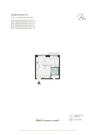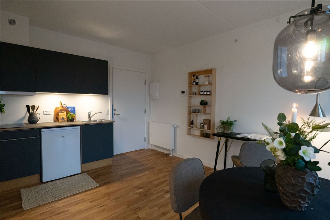 Rummelig 1-værelses lejlighed med fransk altan, eget badeværelse og mindre køkken. Herudover findes fælles køkkener i ejendommen.