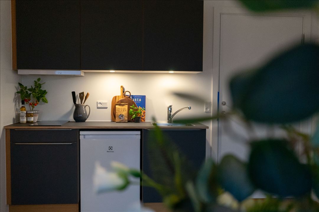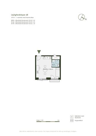 Rummelig 1-værelses lejlighed med fransk altan, eget badeværelse og mindre køkken. Herudover findes fælles køkkener i ejendommen.