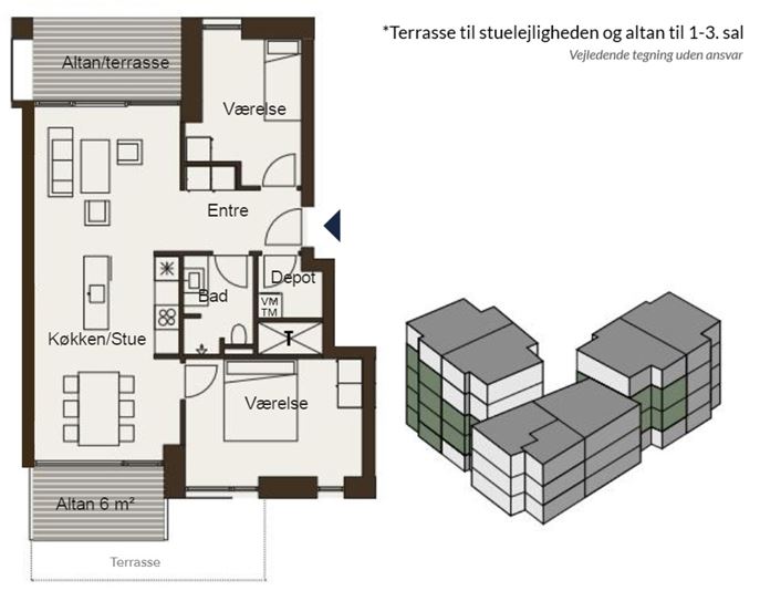 Boligerne varierer fra 2-3-værelses og er fra 65-95 kvm. Alle boliger har enten terrasse eller altan.