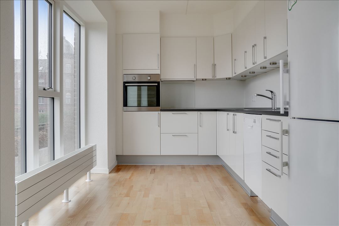 Lejlighedens stue/køkken/alrum er et rummeligt og lyst område perfekt til både afslapning og underholdning. Den aflange form skaber en naturlig opdeling mellem stue og køkken samtidig med at bevare en følelse af åbenhed og sammenhæng. De store vinduer i stuen bringer masser af naturligt lys ind i rummet med mulighed for at åbne op til den franske altan. Køkkenet, moderne og veludstyret, er designet med funktionalitet i tankerne. Det er det ideelle sted at udfolde dine kulinariske færdigheder og samtidig være i selskab med gæster eller familie. Fra stuen har du også indgang til soveværelset med god plads. Det store vindue sikrer rigeligt naturligt lys og det rummelige layout giver mulighed for at skabe en behagelig og personlig atmosfære.
