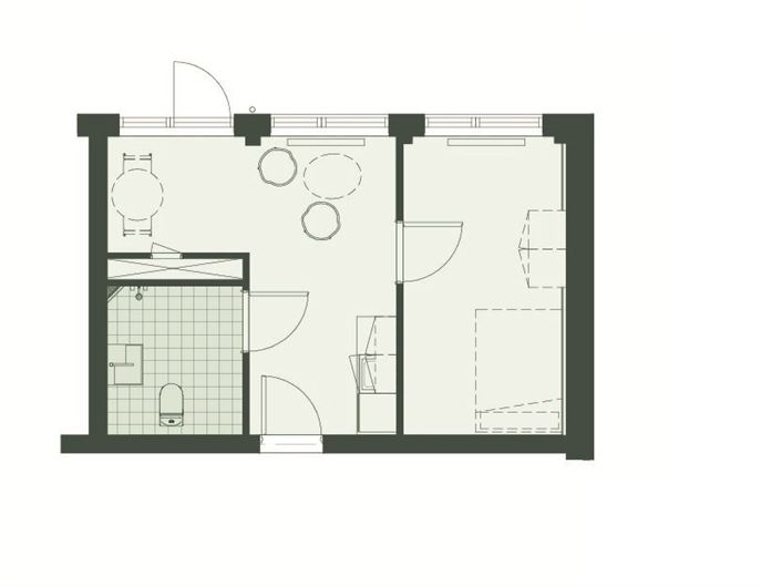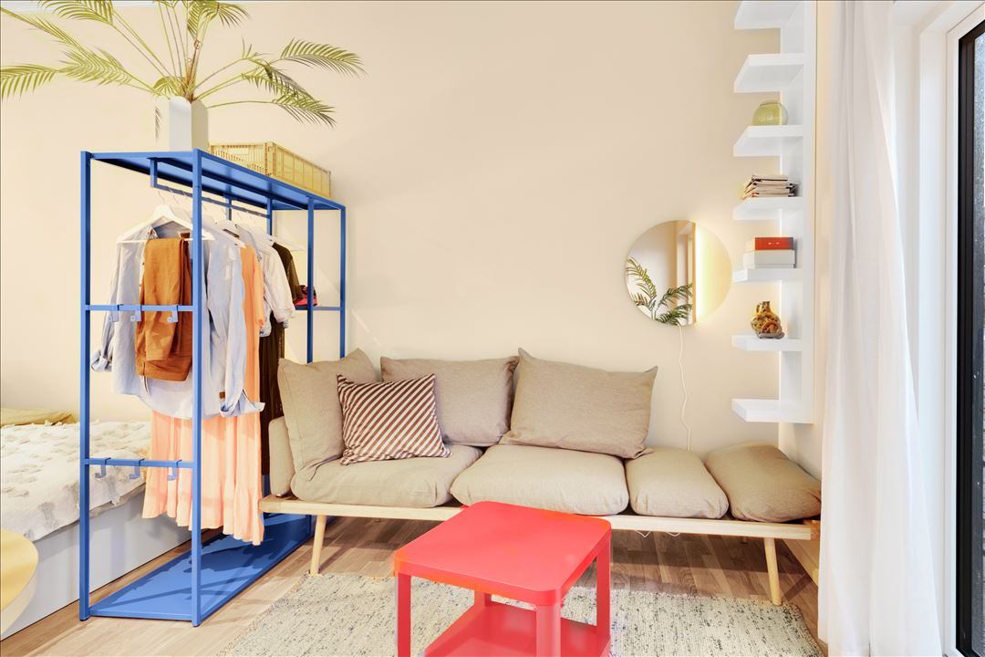 Lejligheden er nem at indrette, og der er plads til både dobbeltseng, sofa og spiseplads – kun fantasien sætter grænser