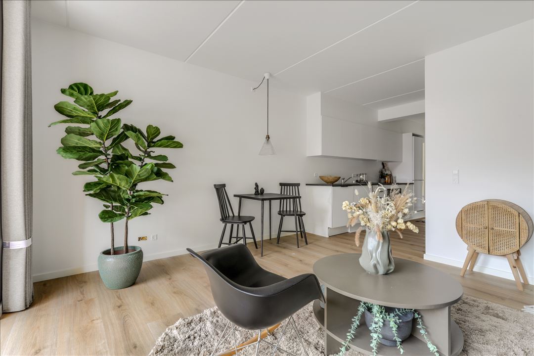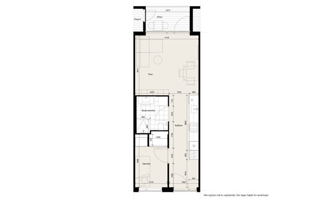 Med denne toværelses lejlighed, får du soveværelse, badeværelse og et moderne køkken i sammenhæng med en lys stue. På badeværelset er der gjort plads til en vaskesøjle, hvis du ønsker det, ligesom der også opvaskemaskine i køkkenet.