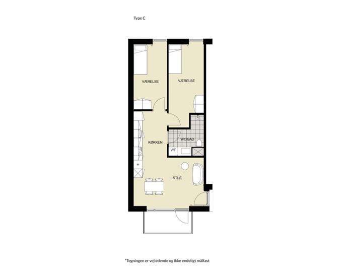 Lejligheden byder dig ind i et rummeligt køkken/alrum med plads til både spiseplads og opholdsområde. I køkken/alrummet er der placeret store vinduer og direkte adgang til lejlighedens altan, hvilket giver et fantastisk sammenhæng mellem uderummet og køkkenalrummet.Lejligheden er indrettet med to værelser, begge har store gulv til loft vinduer som byder solen og lyset ind, samt skabe til opbevaring. Lejligheden har badeværelse med vaskemaskine/tørretumbler og separat brus.