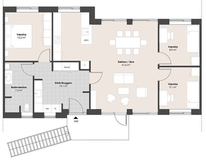 Alle boligerne er lyse og indbydende og findes i størrelserne 2-5 værelser.På badeværelse og i entré/bryggers er der grå klinker på gulvet, mens der i de øvrige rum er lyse laminatgulve med egetræslook. Der er faste hvide HTH-elementer i køkken, bad, værelser og entré/bryggers. Alle boliger er udstyret med fuld hvidevarer pakke. Dertil kommer, at der er installeret ventilationsanlæg og gulvvarme i hver bolig, hvilket giver et godt indeklima og stabil varme.