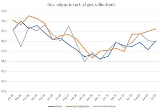 Hvor der således i december 2022 var 6 procents afstand mellem udbudspriserne og salgspriserne på villaer, er denne nu reduceret til ca. 4 procent. Tilsvarende gælder for både ejerlejligheder og sommerhuse. Den begyndende forbrødring er tegn på, at sælgerne er blevet mere realistiske og køberne mere optimistiske.